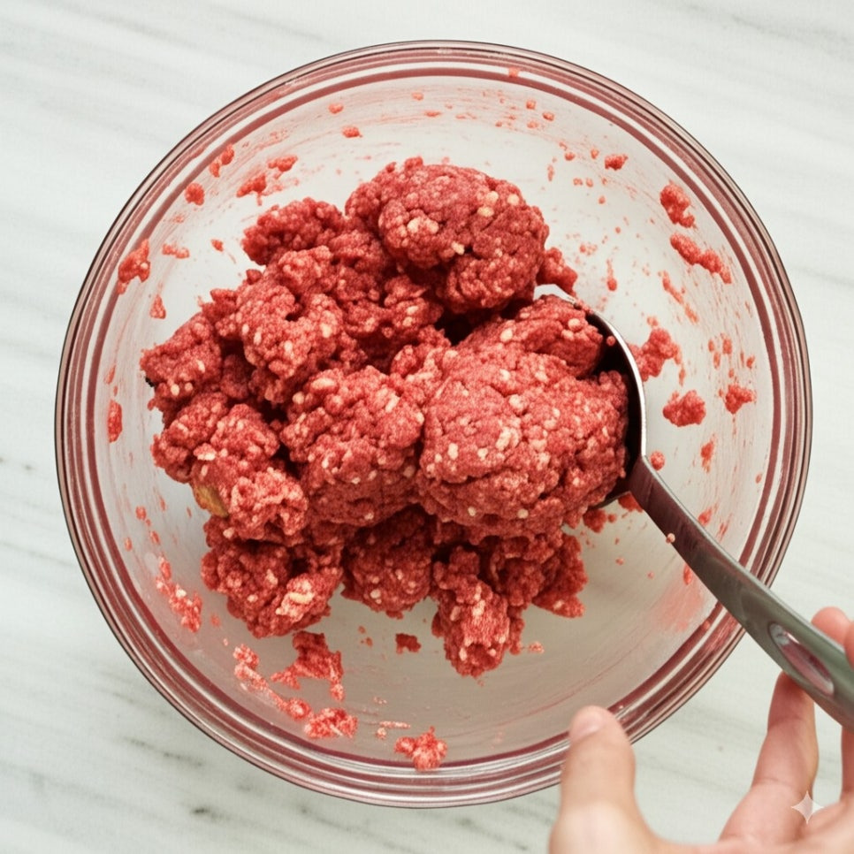 <이미지: 볼에 다진 고기와 각종 양념 재료를 넣고 손으로 치대는 모습>