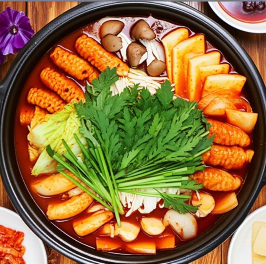 <이미지: 완성된 곱창전골에 쑥갓을 올려 마무리하는 모습>