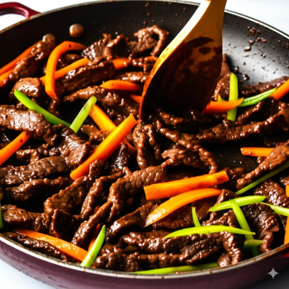 <이미지: 팬에 양념된 소고기와 채소들을 넣고 볶는 모습>