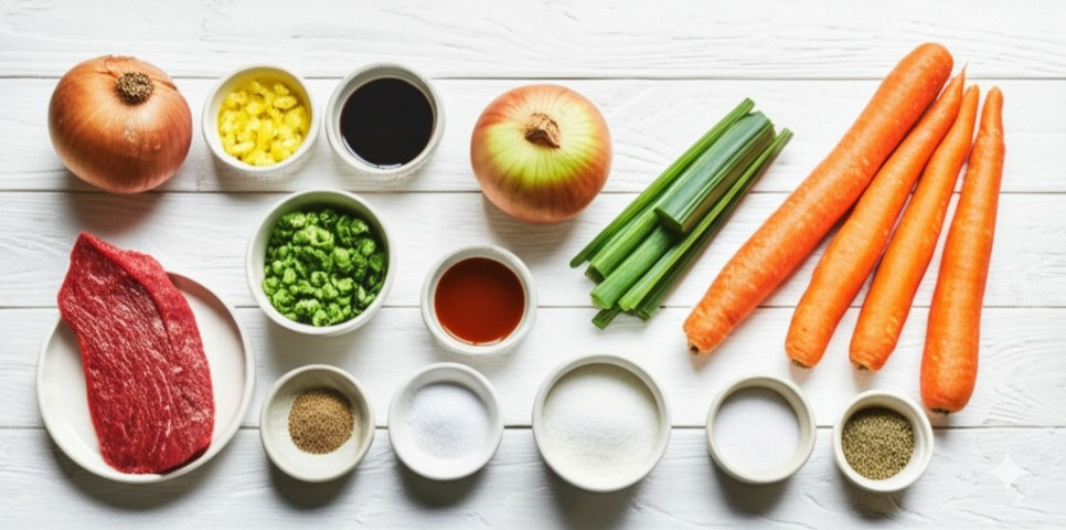 <이미지: 간장 불고기 재료 (소고기, 양파, 대파, 당근, 간장, 설탕, 다진 마늘 등)>
