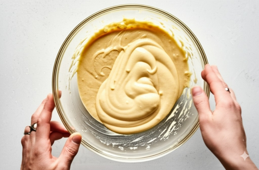 <이미지: 남은 머랭을 모두 넣고 조심스럽게 섞는 모습>