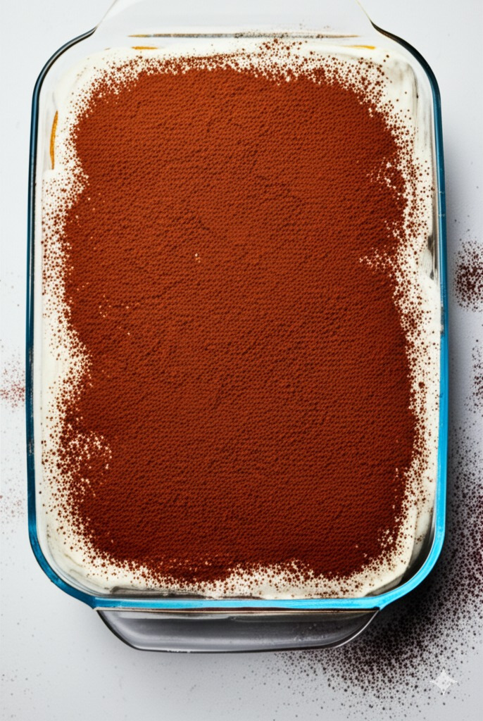 <이미지: 티라미수 위에 코코아 파우더를 뿌리는 모습>
