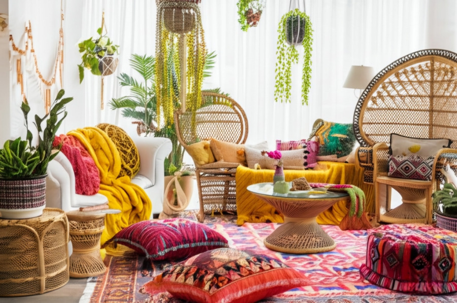 보헤미안 스타일: 자유로운 감성과 다채로운 컬러, 패턴의 패브릭, 독특한 소품을 활용하여 개성 넘치는 공간을 연출합니다. 자연 소재의 가구와 플랜테리어를 믹스매치합니다.