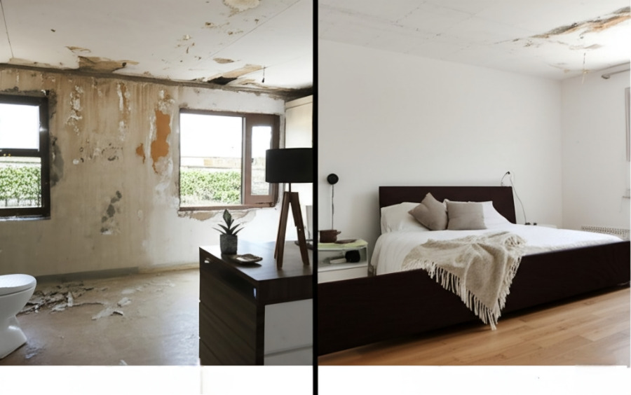 <이미지: 전원주택 인테리어 Before & After 비교 사진 (오래되고 낡은 공간에서 자연 친화적이고 아늑하며 실용적인 공간으로 변화된 모습)>