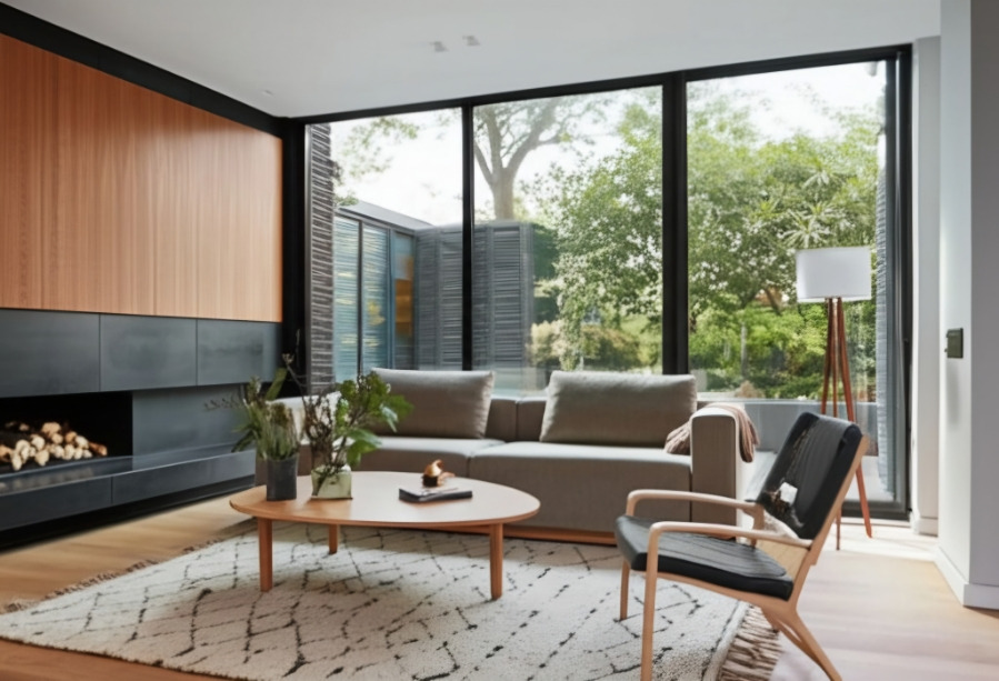 <이미지: 모던한 가구와 우드 소재, 넓은 창으로 자연을 담은 전원주택 거실>