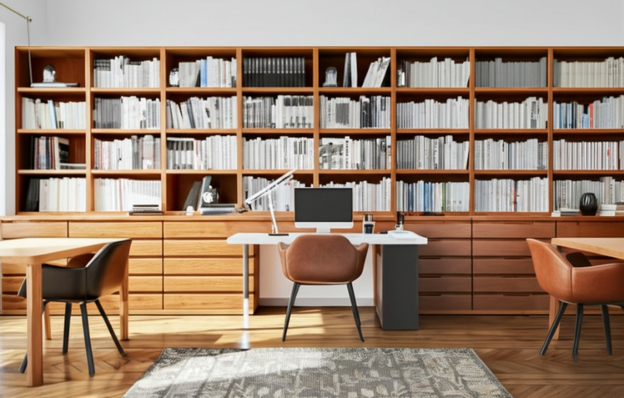<이미지: 큰 창과 책상, 책장이 있는 전원주택 서재 인테리어>