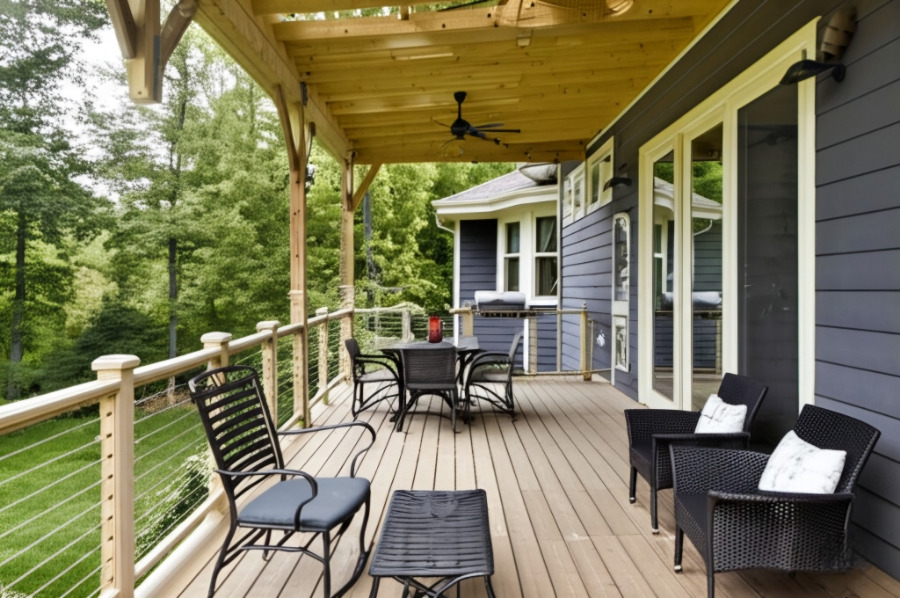 <이미지: 거실과 이어지는 넓은 나무 데크와 아웃도어 가구가 놓인 전원주택>