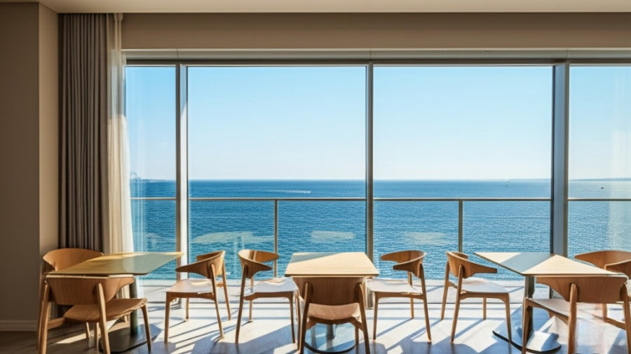 <이미지: 성산일출봉이 보이는 카페 창밖 풍경>