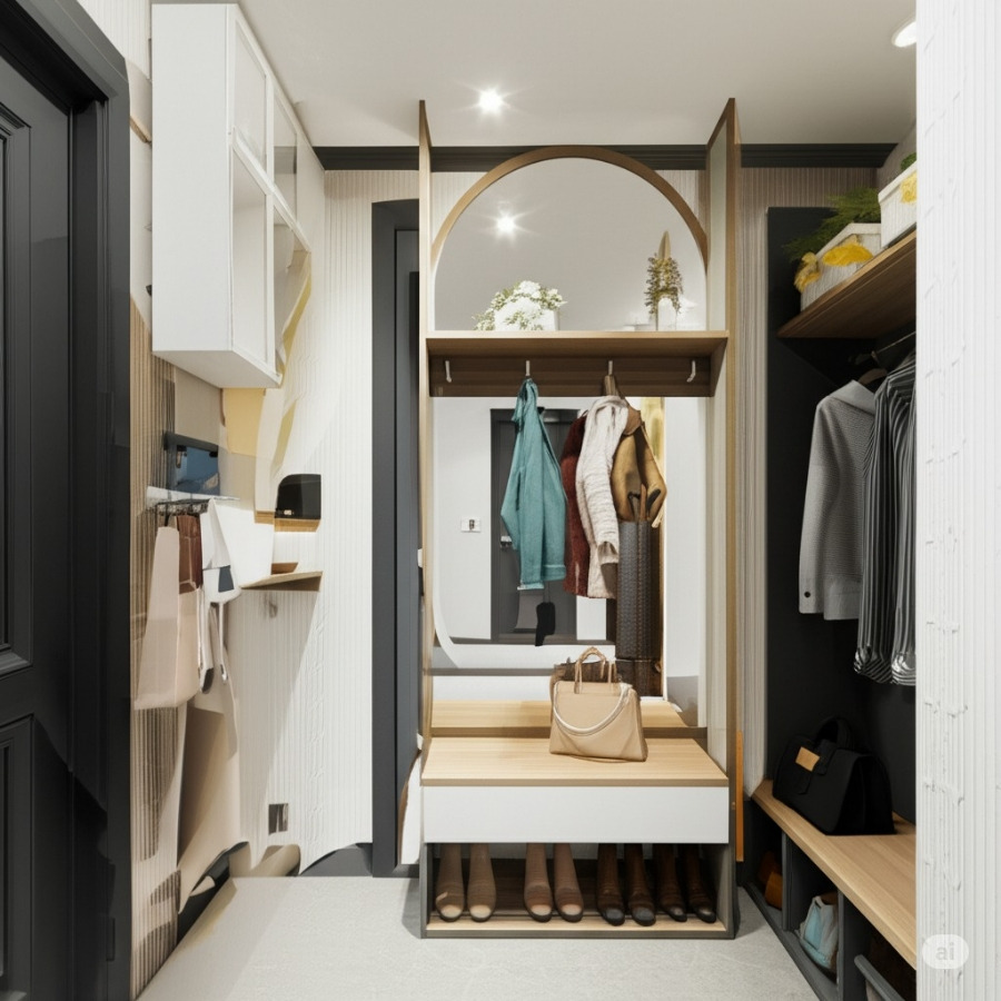 간접 조명: 신발장 하부, 거울 뒤, 벽면 등에 간접 조명을 설치하여 은은하고 분위기 있는 공간을 연출하고, 시각적으로 넓어 보이는 효과를 줍니다.