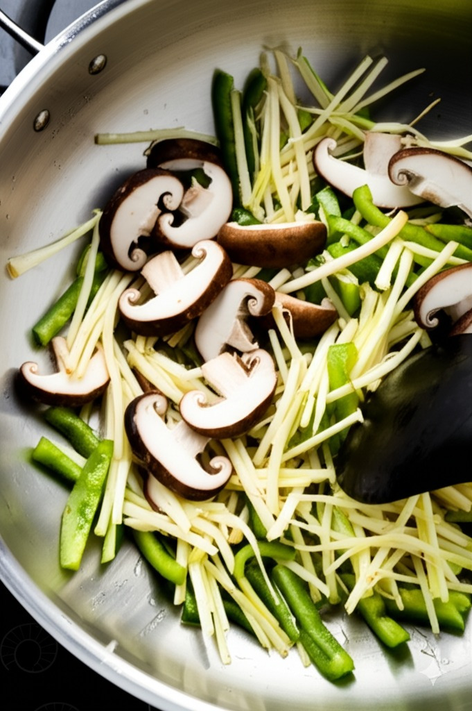 돼지고기와 새우가 익으면 준비한 버섯, 죽순, 양파, 피망을 넣고 함께 볶아줍니다.