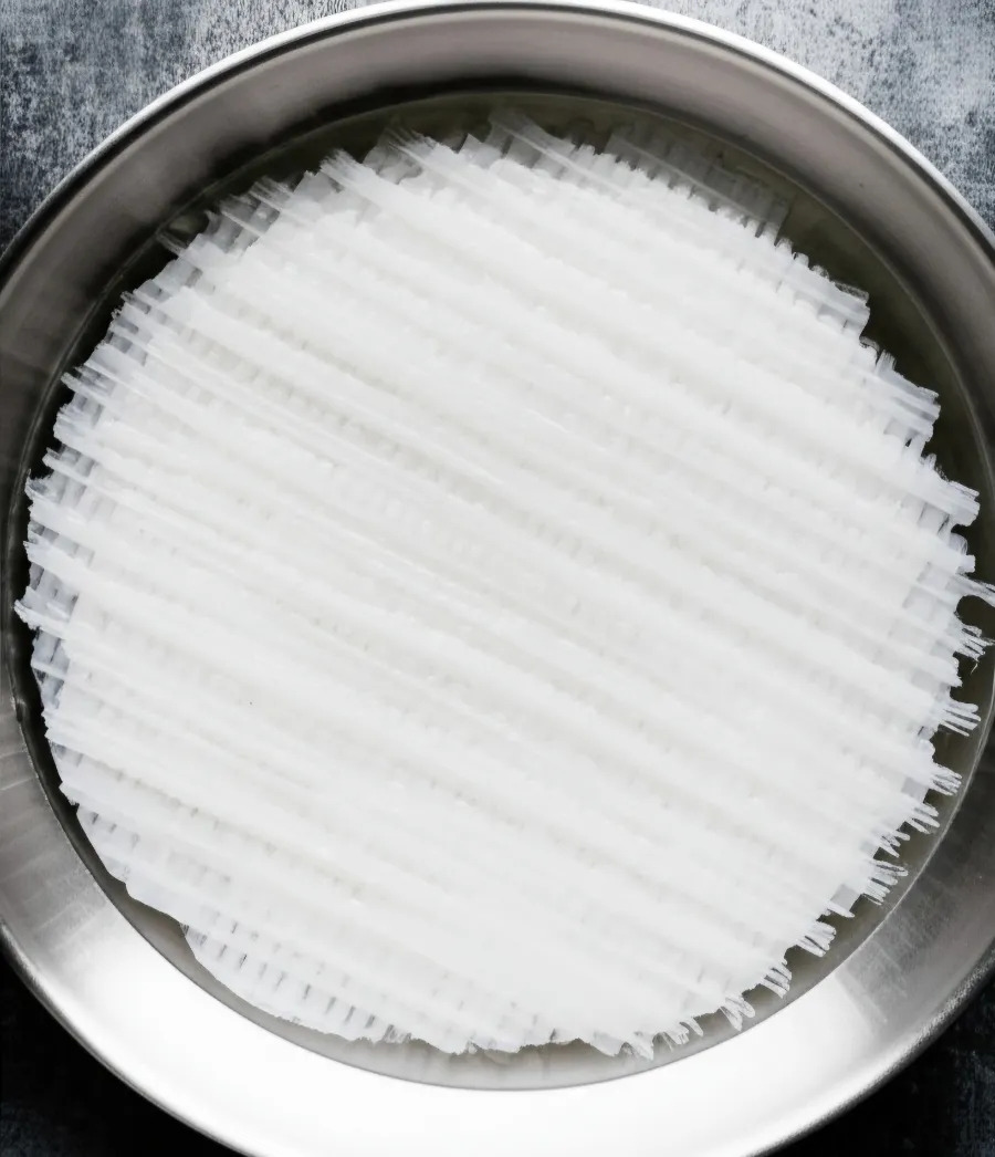 따뜻한 물에 라이스페이퍼를 살짝 담갔다가 꺼냅니다. 너무 오래 담그면 찢어질 수 있으니 주의하세요.