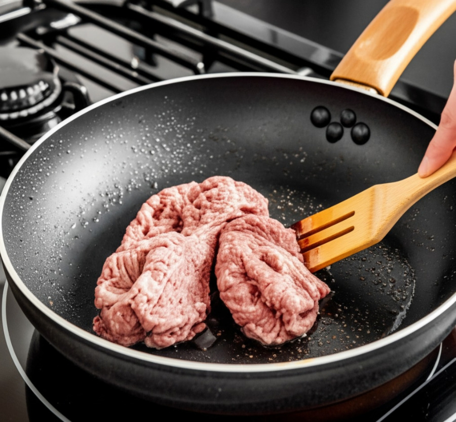<이미지: 밑간된 고기가 팬에서 맛있게 볶아지는 모습>