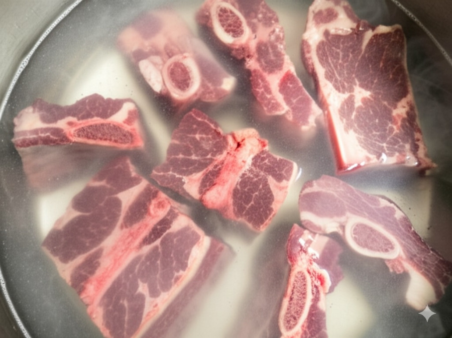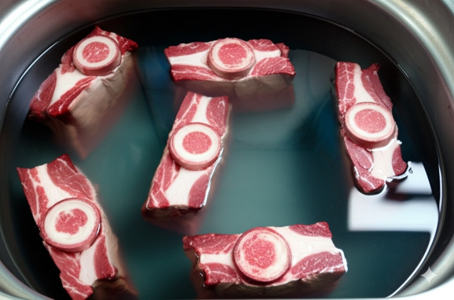 <이미지: 핏물을 빼고 있는 사골과 고기의 모습>