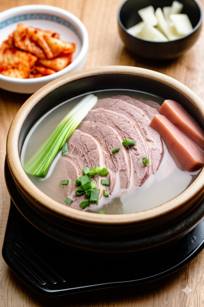 <이미지: 완성된 설렁탕이 담긴 뚝배기에 밥과 고명이 올려진 모습>