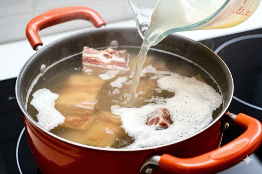<이미지: 사골과 잡뼈를 초벌로 삶아 불순물이 떠오른 모습>
