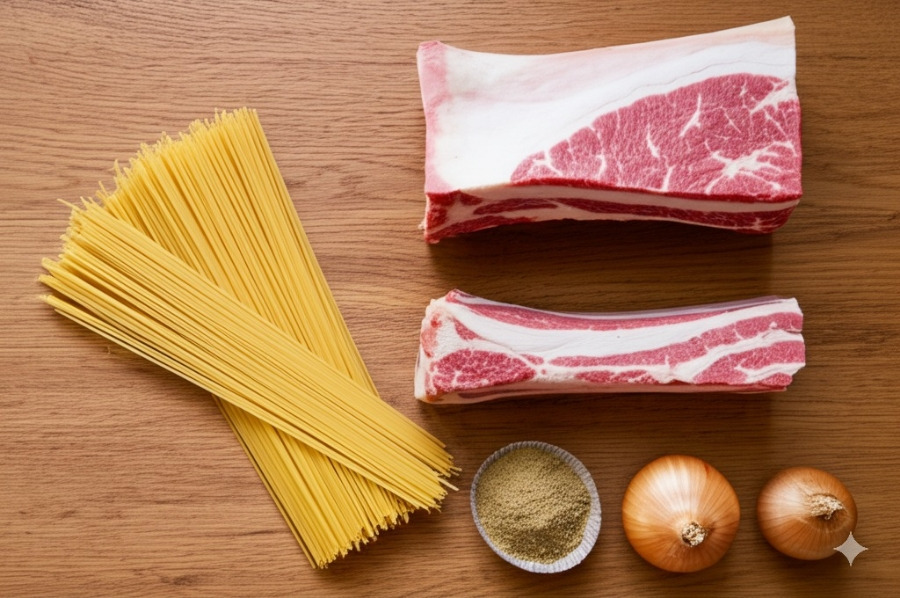 <이미지: 설렁탕 재료 (소 사골, 잡뼈, 양지머리, 대파, 마늘 등)>