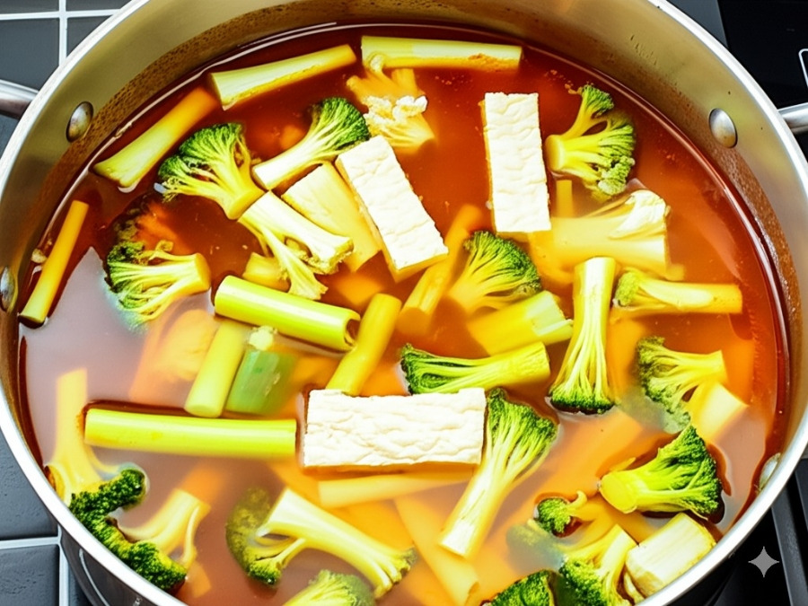 **<이미지: 채소와 건두부를 육수에 넣고 끓이는 모습>**