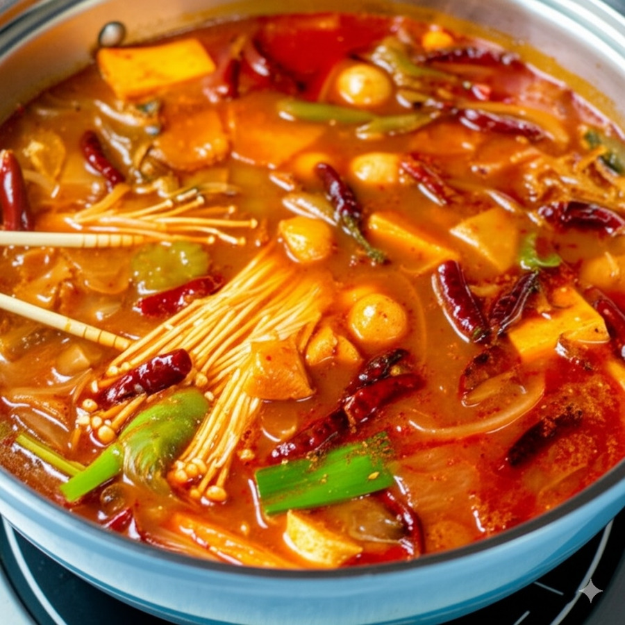 **<이미지: 김이 모락모락 나는 마라탕 (각종 재료와 얼큰한 국물이 보이는 클로즈업 사진)>**