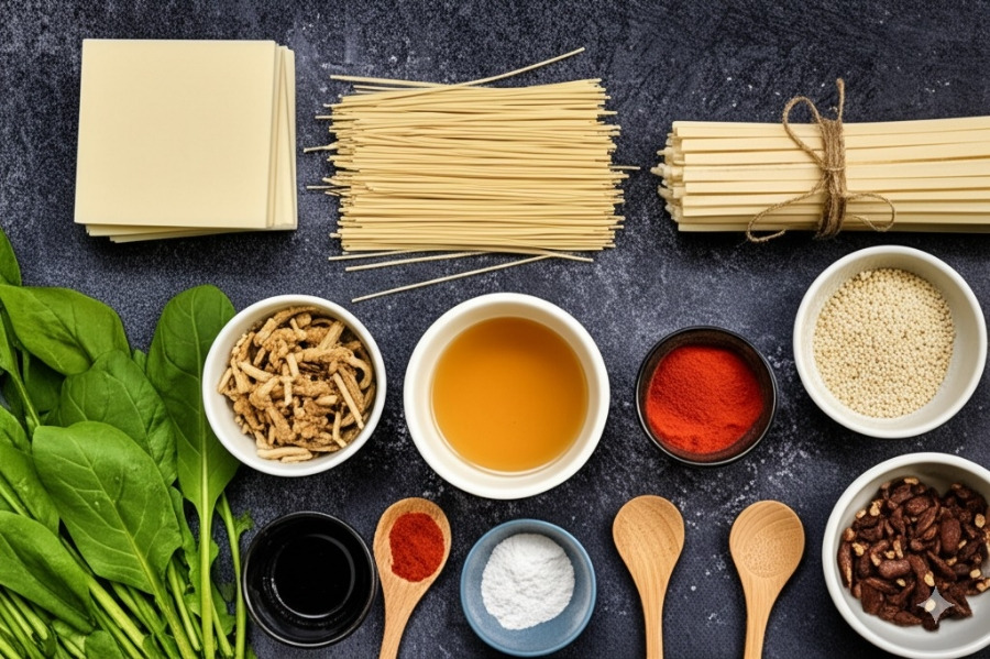 **<이미지: 마라탕 재료 (마라탕 소스, 건두부, 중국 당면, 각종 채소, 버섯, 육수 재료 등)>**