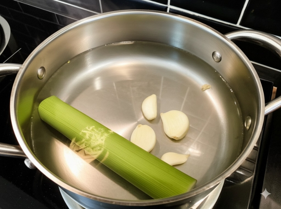 **<이미지: 육수 재료를 넣고 끓이는 모습>**