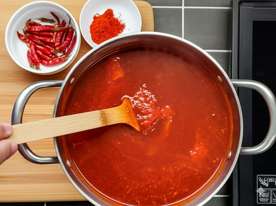 **<이미지: 육수에 마라탕 소스를 풀고 있는 모습>**