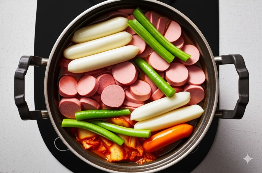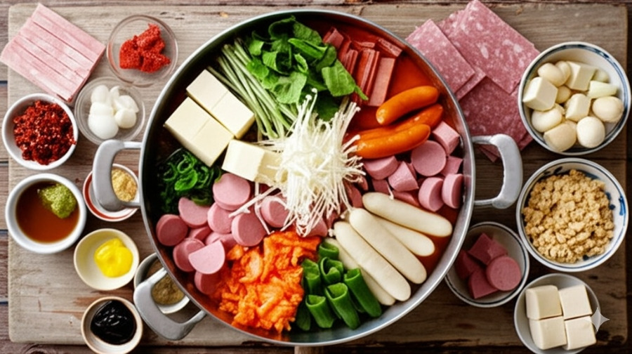 **<이미지: 부대찌개 재료 (김치, 양파, 대파, 두부, 각종 햄, 라면 사리 등)>**