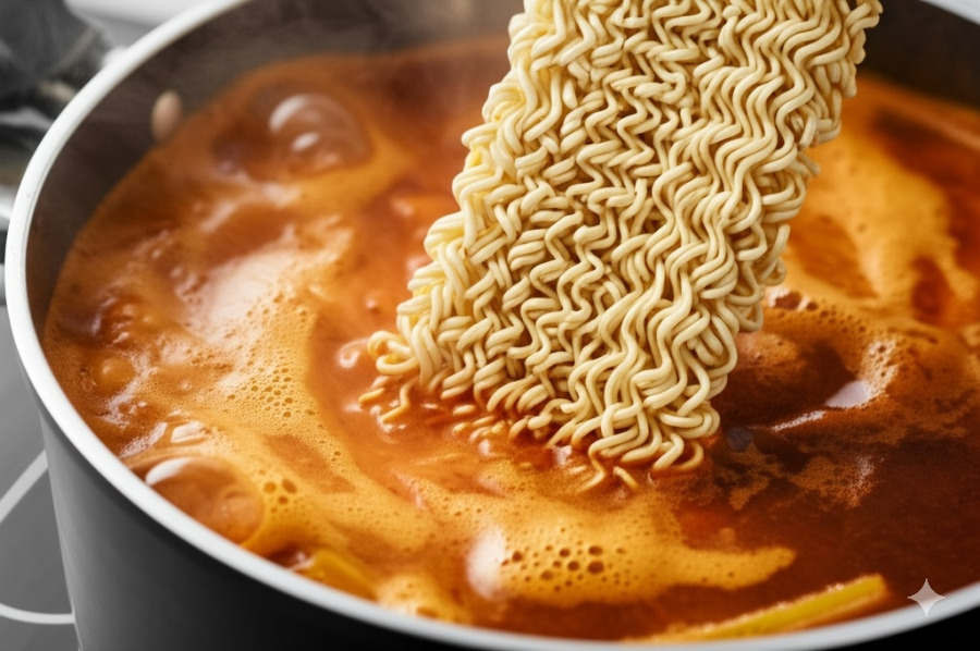 국물이 끓기 시작하면 라면 사리를 넣고 면이 익을 때까지 끓여줍니다. 기호에 따라 끓이는 중간에 다진 마늘이나 고춧가루를 추가해도 좋습니다.
