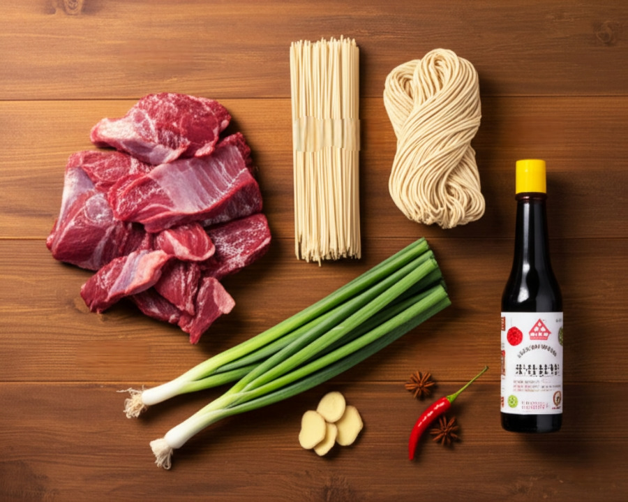 <이미지: 소고기, 생강, 대파, 마늘 등 기본 재료와 두반장, 간장, 설탕, 그리고 팔각, 계피 등 향신료가 함께 놓여있는 모습. 면과 선택 재료인 무, 고수 등도 보여준다.>
