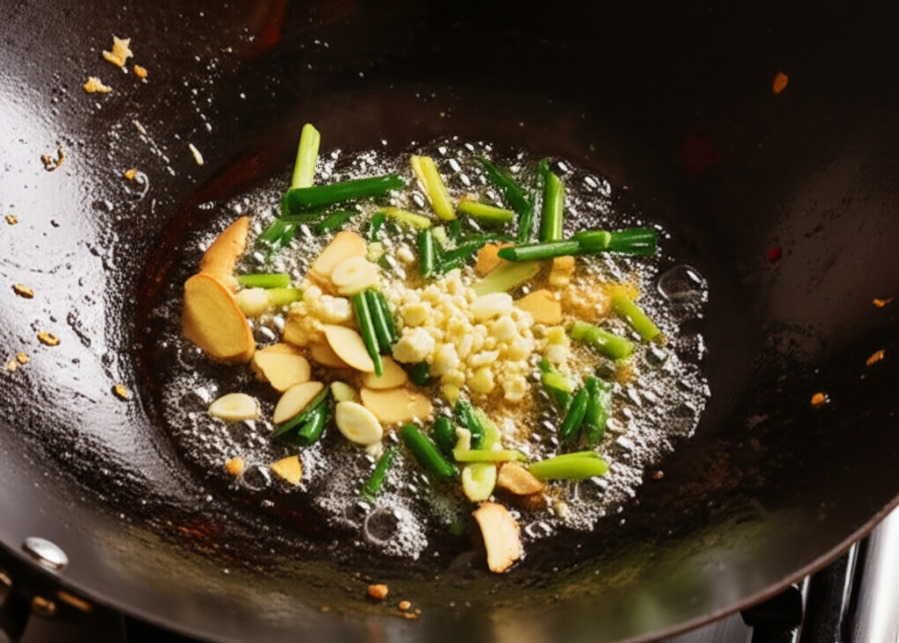 <이미지: 냄비에 생강, 마늘, 대파를 넣고 볶는 모습>