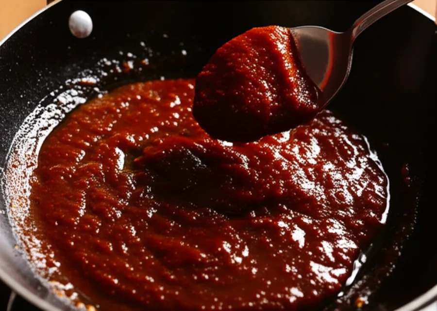 <이미지: 볶은 두반장에 소고기와 향신료를 넣고 볶는 모습>