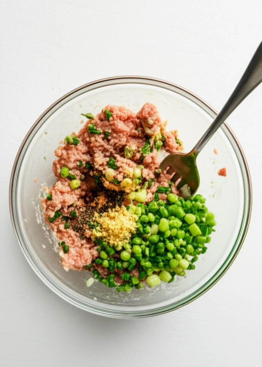 ③ 넓은 볼에 돼지고기 다짐육, 물기를 짠 채소와 두부(또는 숙주), 다진 마늘, 다진 생강, 간장, 굴소스, 참기름, 후추를 모두 넣습니다.