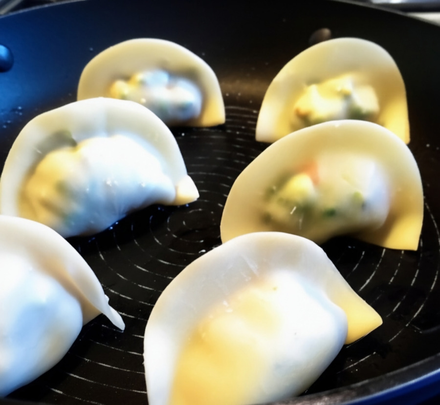 <팬에 만두를 올리고 바닥을 굽는 모습>