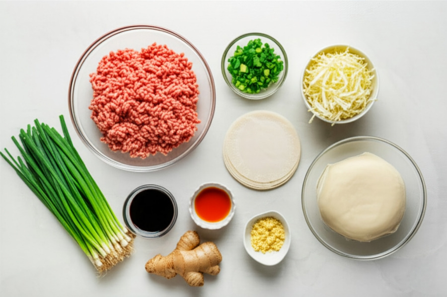 <이미지: 돼지고기 다짐육, 만두피, 부추, 양배추 등 만두소 재료와 간장, 참기름 등 양념 재료들이 정갈하게 놓여있는 모습. 두부와 숙주가 있다면 함께 보여준다.>