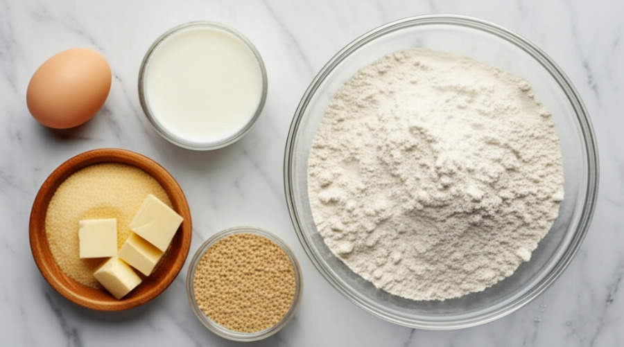<이미지: 팥앙금빵 재료 (강력분, 설탕, 소금, 이스트, 우유, 달걀, 버터, 팥앙금 등)>