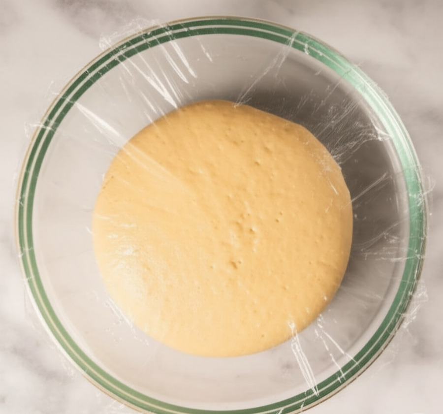 반죽을 둥글게 뭉쳐 볼에 넣고 랩을 씌운 후 따뜻한 곳 (약 28~30°C)에서 1시간 ~ 1시간 30분 정도, 반죽의 부피가 2배로 부풀 때까지 발효합니다.
