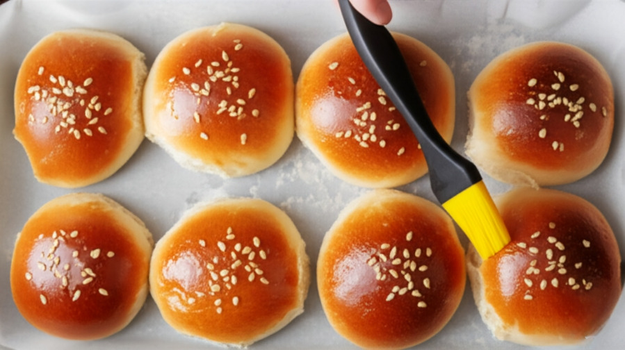 <이미지: 반죽 윗면에 달걀물을 바르고 검은깨를 뿌리는 모습>