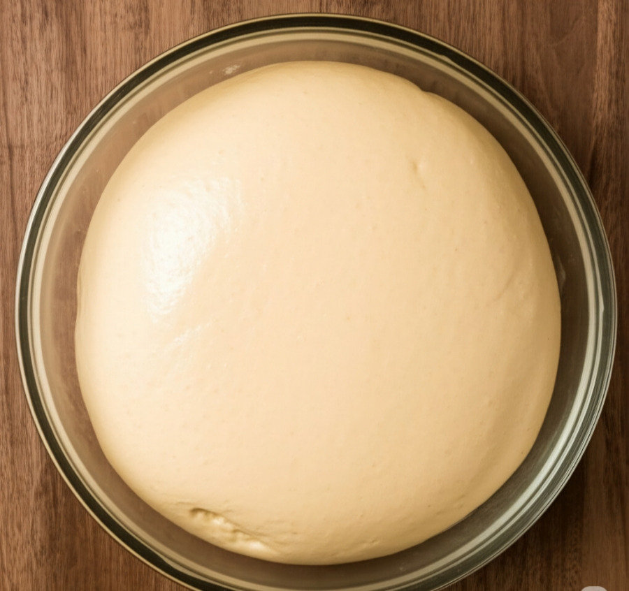 <이미지: 1차 발효를 마친 반죽 (부피가 2배로 부풀어 오른 모습)>