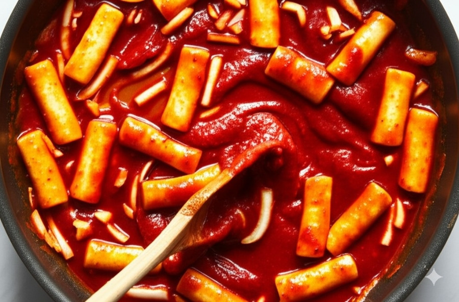 **<이미지: 닭고기와 양파, 떡볶이 떡에 불닭 양념을 넣고 볶는 모습>**