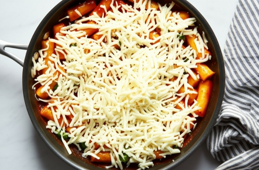**<이미지: 볶음 요리 위에 모짜렐라 치즈를 골고루 뿌리는 모습>**