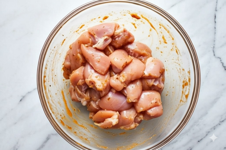 **<이미지: 볼에 담긴 닭고기에 밑간 재료를 넣고 버무리는 모습>**