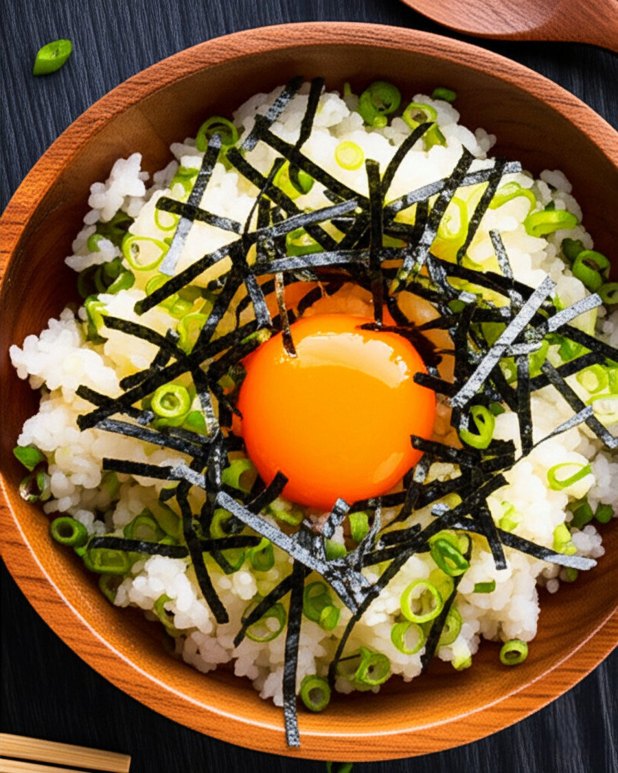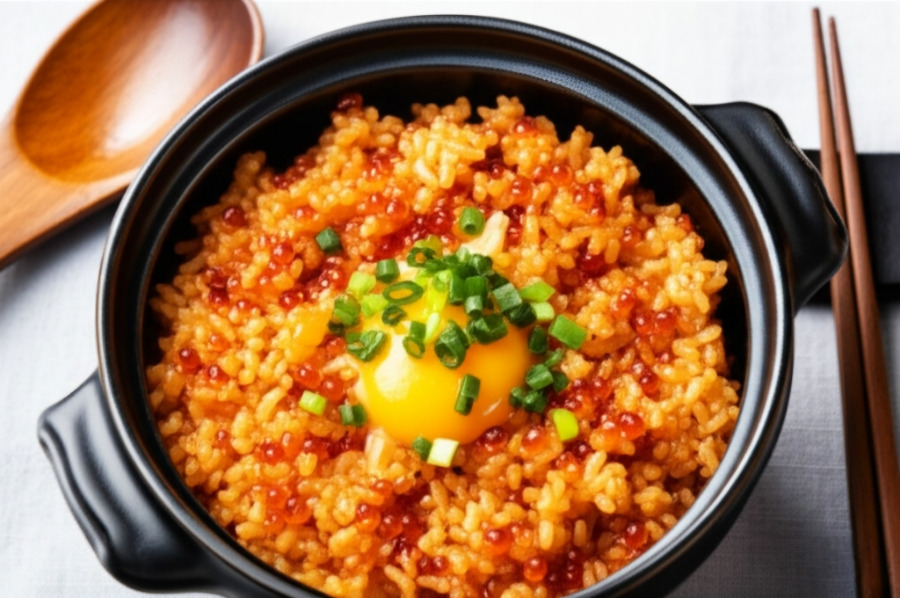 <이미지: 그릇에 담긴 명란솥밥 위에 김가루와 쪽파, 달걀 노른자가 올려진 모습>