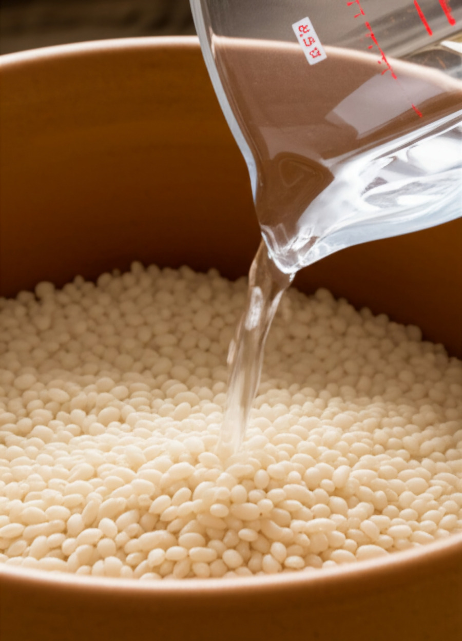 <이미지: 쌀을 깨끗하게 씻어 물에 불리는 모습>