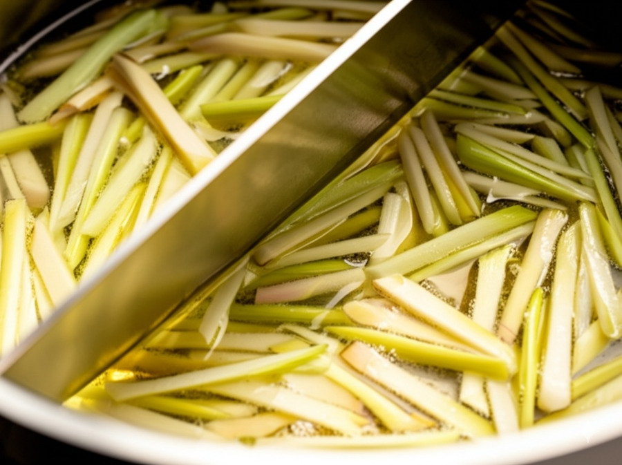 <이미지: 갈랑갈과 레몬그라스가 기름에 볶아지는 모습>