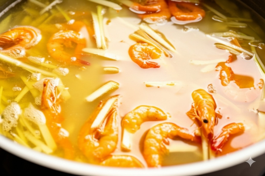 어느 정도 끓으면 새우를 넣고 새우가 익을 때까지 끓여주세요. 너무 오래 끓이면 새우가 질겨질 수 있으니 주의합니다.