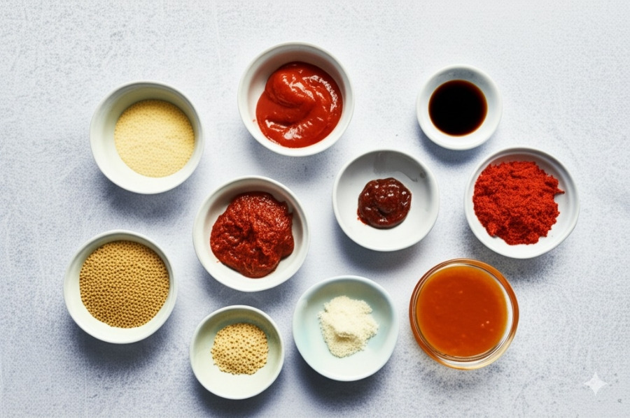<이미지: 비빔냉면 양념장 재료들이 작은 볼에 담겨 있는 모습>