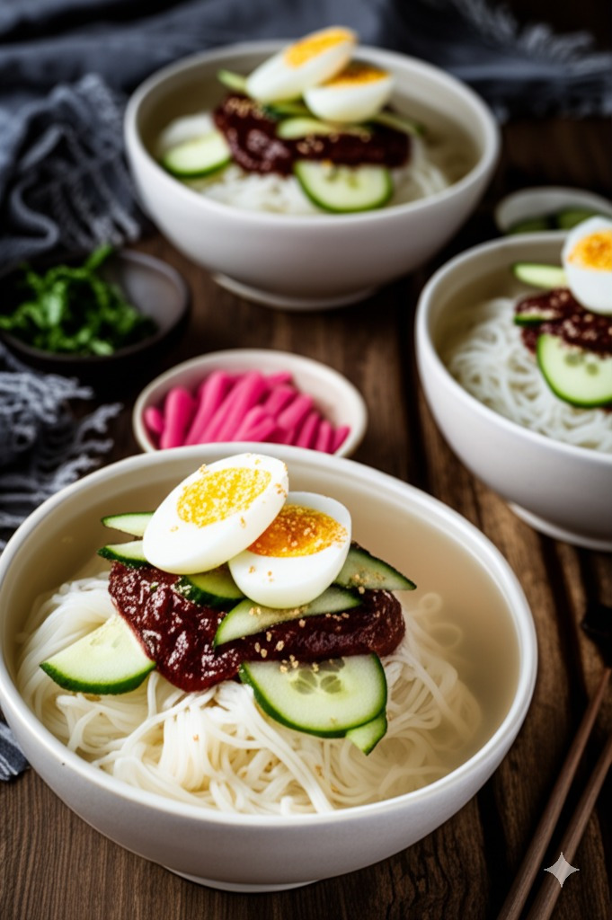 짜잔! 집에서 만든 시원한 냉면 완성! 😋 더운 여름, 집에서 푸짐하고 맛있는 냉면을 즐겨보세요!