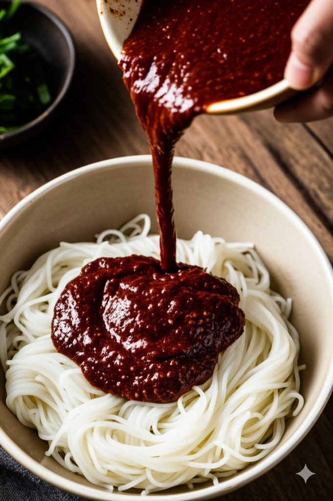 볼에 고춧가루, 고추장, 간장, 다진 마늘, 설탕, 식초, 참기름, 물엿 (선택), 깨소금을 넣고 잘 섞어 비빔냉면 양념장을 만들어줍니다. 냉장고에 잠시 숙성시키면 더욱 깊은 맛이 납니다.