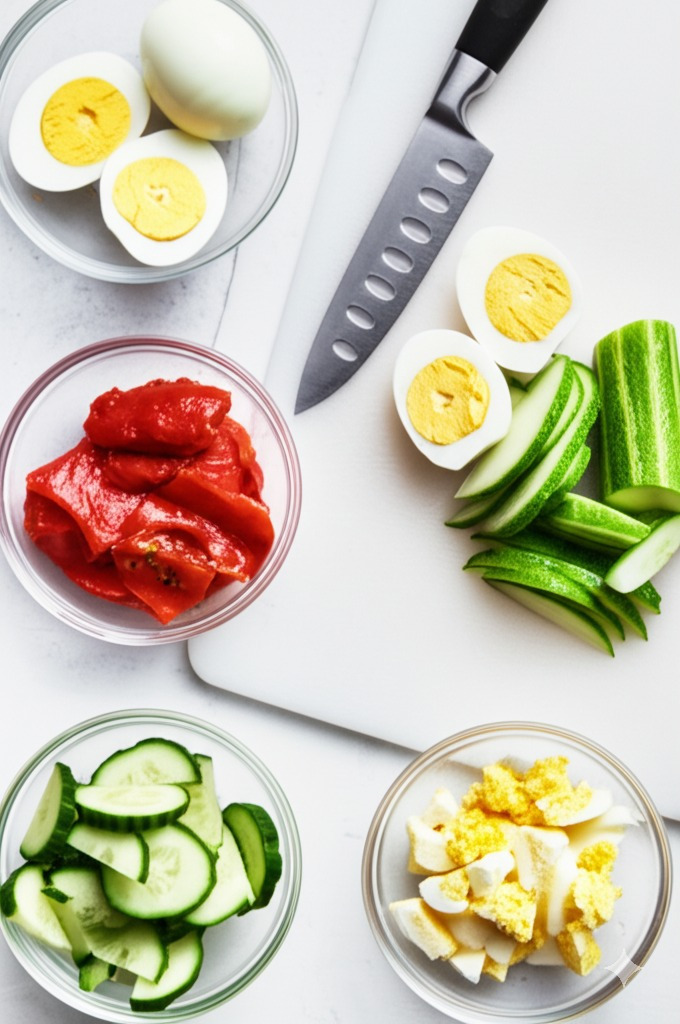 <이미지: 오이를 채 썰고, 무 절임을 썰고, 삶은 계란을 반으로 자르는 모습>