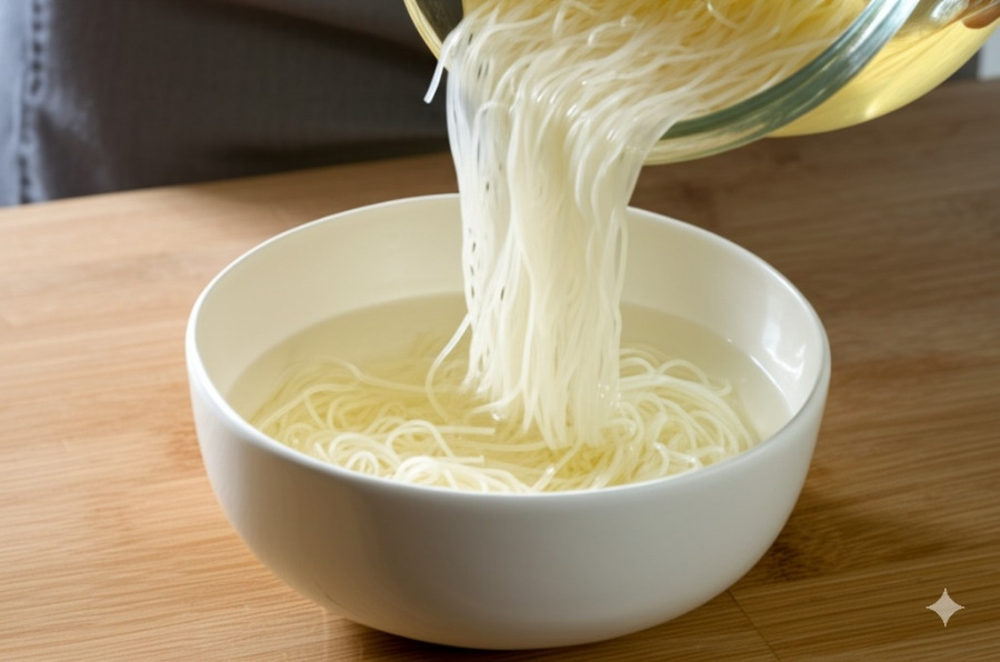 <이미지: 그릇에 삶은 쌀국수 면을 담고 육수를 붓는 모습>