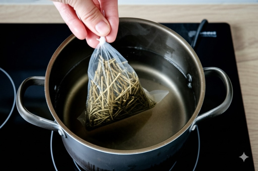 <이미지: 냄비에 멸치 다시마 팩을 넣고 육수를 끓이는 모습>